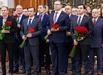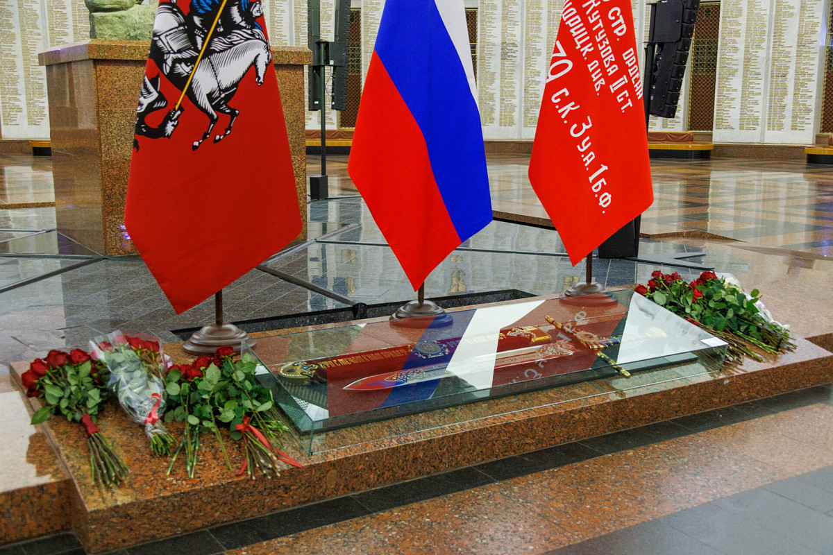 Участники акции возложили цветы к монументу Солдату-победителю в Зале Славы, а также посмотрели светозвуковую инсталляцию «Дорога к Победе».