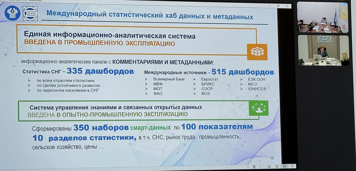 Одним из перспективных направлений является также развитие горизонтальных связей. В частности, Трефилов Д.А. отметил потенциал взаимодействия между статистическим блоком и Межгосударственным советом по геодезии, картографии, кадастру и дистанционному зондированию Земли, который завершает работу над Геопорталом СНГ. Интеграция статистических данных в эту платформу и, наоборот, использование геоданных для наполнения статистического хаба могут дать значительный мультипликативный эффект для всех государств-участников.