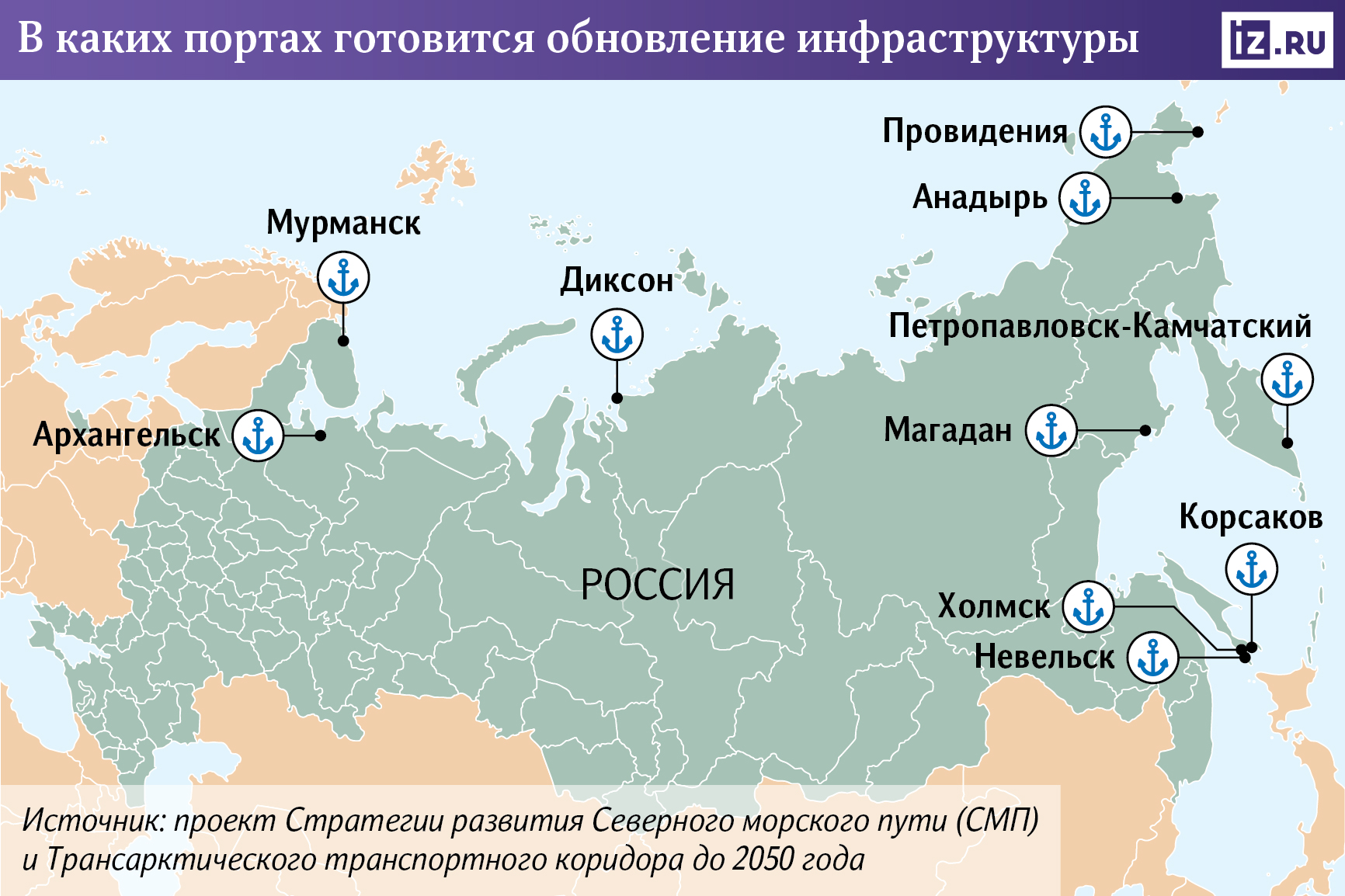 В России готовится масштабное обновление портовой инфраструктуры, выяснили «Известия». Наращивание грузопотока ожидает Мурманск, Архангельск, Магадан, Корсаков, Петропавловск-Камчатский и другие. Это позволит расширить торговлю с Китаем, Индией и еще рядом стран. Такой проект ведомствам предложен в рамках Стратегии развития Северного морского пути и Трансарктического транспортного коридора. Под него может быть создана спецпрограмма ВЭБ.РФ. Сколько будет стоить проект и откуда возьмут на него деньги — в материале «Известий».