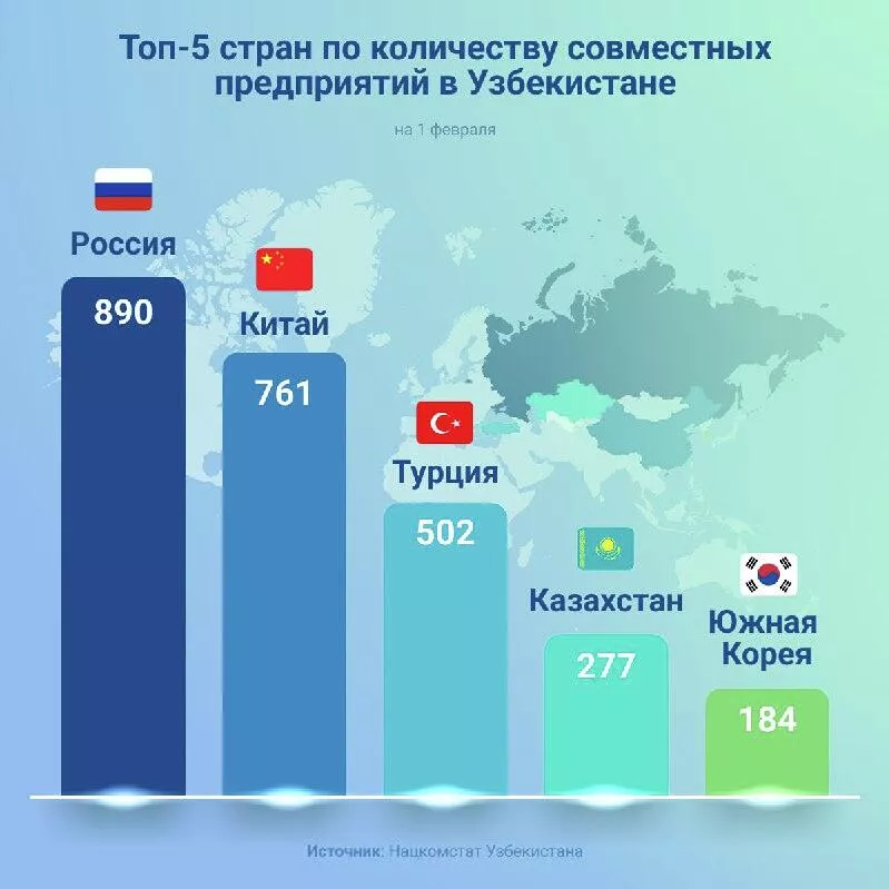 Наибольшее количество совместных с Узбекистаном предприятий приходится на Россию.